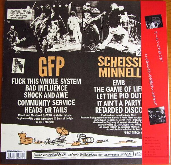 かたやドイツからはすでに4枚のアルバムをリリースしている SCHEISSE MINNELLI(ドイツ語でSCHEISSE=シャイセは"糞"、英語で言うところの"shit"の意)。2003年に結成され2人のアメリカ人と2人のドイツ人からなるバンド。AGNOSTIC FRONT(VICTIM IN PAINリリースした頃)のサウンドにBEASTIE BOYSの"cooky puss EP"や STUPIDSのノリをミックスしたGFPにも引けを取らない痛快なスケート・ハードコア・パンク・サウンド。TESCO VEE(THE MEATMEN)がゲスト・ヴォーカルで参加! 各バンド5曲ずつ収録。
