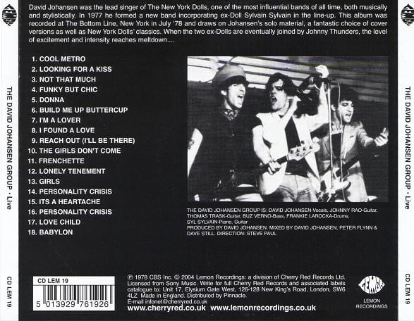 78年6/21にN.Y.のBOTTOM LINEで収録された、New York DollsのDavid Johansen率いる『DAVID JOHANSEN GROUP』 のライブ盤。元々78年にプロモ盤LP(9曲収録)としてリリースされた音源 が、93年にCDとしてオフィシャル・リリースされた。そのアルバムがUKの LEMON RECORDINGSより2004年再発!!全18曲入り!