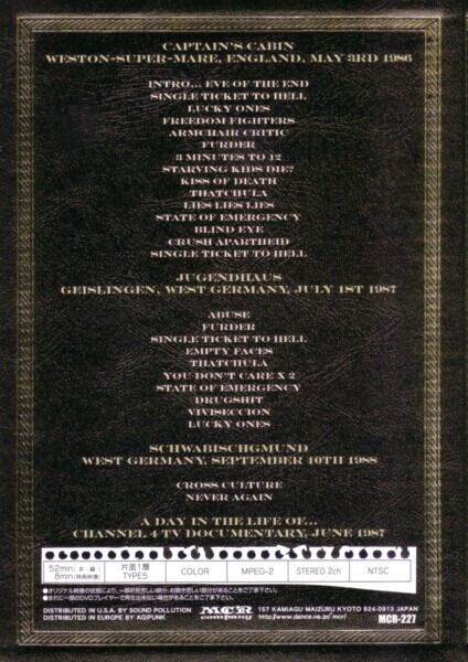 HERESYと並ぶ栄光のLATE 80's BRITISH HARDCORE/THRASHの代表格RIPCORDのオフィシャルビデオ(オリジナルはMCR UKより1992年4月発売/廃盤)がDVDになって蘇えった! 86年から88年の3カ所でのライブを収録。80年代後期、イギリスの地にて、HERESYと共に、突然変異的に登場したアメリカンHCの洗礼を受けたハイエナジー、フルスピードHCスラッシュの奇跡!衝動が火を吹き、新たなうねりとなる歴史的瞬間をばっちりとらえた感動の絶版映像の待望再発!!更にオリジナルVHSビデオ25曲より2曲増えた27曲入り。1986年にVOCAL "BUZBY"が取材を受けたドキュメンタリー番組に日本語テロップをつけた特典映像、さらに27枚の貴重なフライヤー・ギャラリーも特典で付いています!!(2008年作)